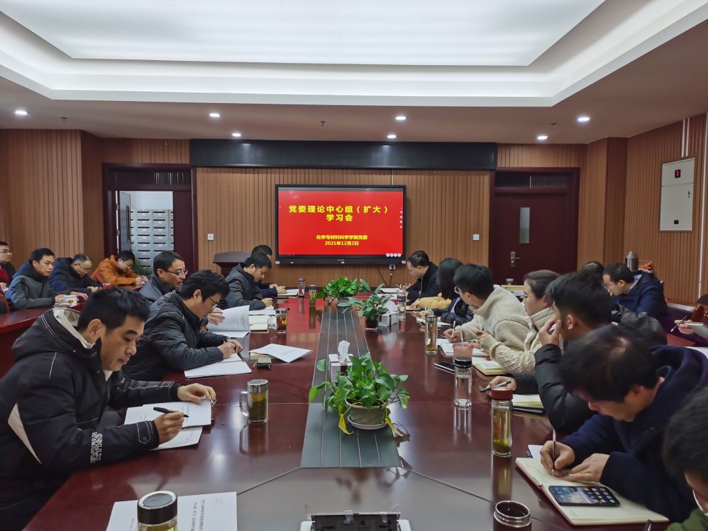 本网讯(化材学院 程紫丹)12月2日,化材学院召开党委理论学习中心组(扩大)学习会,深入学习党的十九届六中全会精神。学院党委委员、纪委委员、各支部书记、科级干部、全体辅导员参加会议。会议由学院党委书记汪俊武主持。