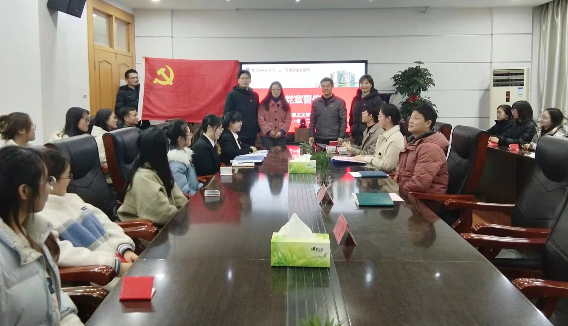 12月20日下午,马克思主义学院在学院四楼第一会议室举办2021年下半年发展党员入党宣誓仪式。学院党委书记严宏、党委副书记刘玉艳、组织员夏盼盼及全体预备党员参加了此次活动。本次宣誓活动由崔航主持。